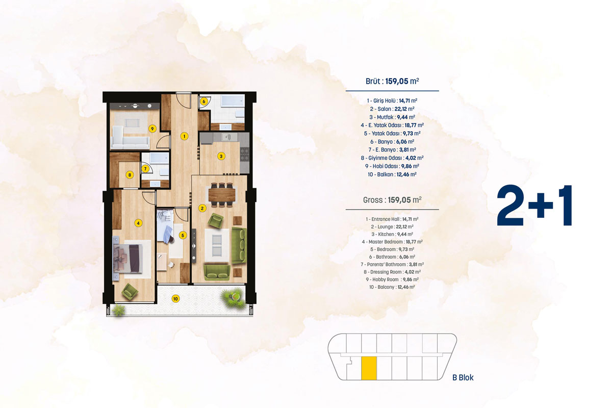 يتكون المشروع من 152 شقة مطلة على البحر في ثلاث مباني مع طابق أرضي + 2 . في إنمارى مرمرة ، شقق 1 + 1 بمساحة 87 إلى 111 متر مربع ، شقق 2 + 1 بمساحة 118 إلى 159 متر مربع ، شقق 3 + 1 بمساحة 145 إلى 244 متر مربع ، وشقق 4 + 1 بمساحة 244 متر مربع.